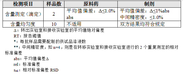 4.轉移豁免 在某些特定的情況下,常規的分析方法轉移可豁免。此時接收方使用轉移方分析方法,不需要比對實驗室間數據。轉移豁免的情況如下:(1)新的待測定樣品的組成與已有樣品的組成類似,和/或活性組分的濃度 與已有樣品的濃度類似,并且接收方有使用該分析方法的經驗。 (2)被轉移的分析方法收載在藥典中,并無改變,此時應采用分析方法確認(見通則《分析方法確認指導原則》)。(3)被轉移的分析方法與已使用方法相同或相似。(4)轉移方負責方法開發、驗證或日常分析的人員調轉到接收方。此方法基本未見實驗室采用,即使符合上述條款,無法保證人員、儀器設備、樣品批間差異、環境等完全一致。
