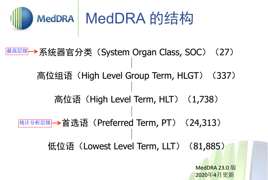 MedDRA術語集分為五個層級,由低到高分別是低位語(LLT,Lowest Level Term)、首選語(PT,Preferred Term)、高位語(HLT,High Level Term)、高位組語(HLGT,High Level Group Term)、系統器官分類(SOC,System Organ Class)。