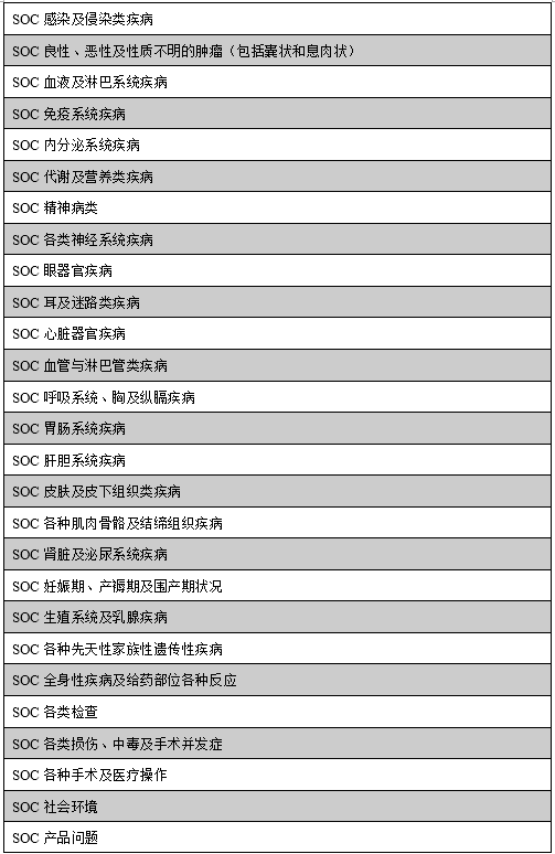 系統器官分類(SOC):最高層級,為數據檢索提供最廣泛的概念。SOC按病因學、發病部位、目的分組。SOC具有多軸性,每個PT對應的主SOC只有一個,最新23.0版本中共有27個SOC。
