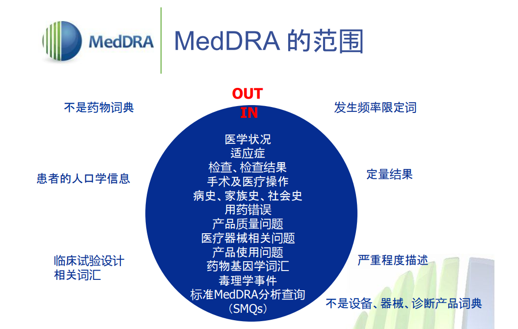MedDRA的全稱是Medical Dictionary for Regulatory Activities(監管活動醫學詞典),是在ICH主辦下編制的,是一個內容豐富詳細的國際醫學術語集,用于人用藥品的整個監管過程(上市前至上市后),包括數據輸入、檢索、評估和表達,旨在促進在國際范圍內共享人類使用的醫療產品的監管信息。