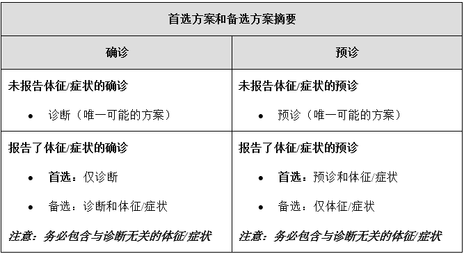 (10)編碼所有報告信息,但不要添加信息:如果報告有診斷及其特征性體征和癥狀,首選方案是僅為診斷選擇術語;如果僅報告了體征或癥狀,不要選擇對應的診斷術語,導致添加信息。