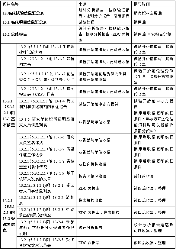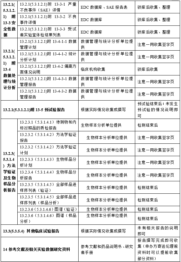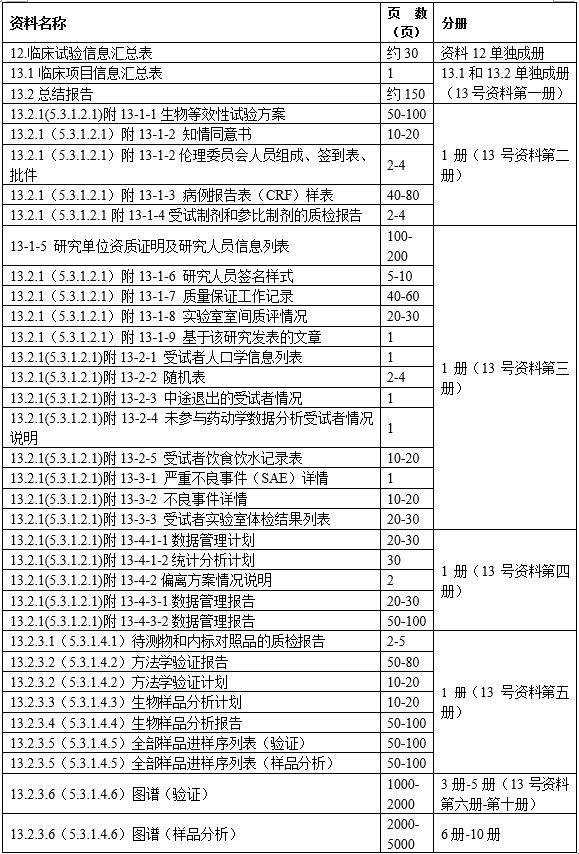 首先將資料12、13、14分開(kāi),再按照各個(gè)部分資料的頁(yè)數(shù)依據(jù)《藥品注冊(cè)申報(bào)資料的體例與整理規(guī)范(藥審中心2011年)》及《藥品注冊(cè)申報(bào)資料格式體例與整理規(guī)范》(2020年10月1日實(shí)施)的要求每?jī)?cè)申報(bào)資料的厚度不大于300張的要求,將資料進(jìn)行分冊(cè),以下表進(jìn)行舉例: