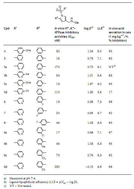 研究者評估了命中化合物的潛力,對吡咯衍生物進行了合成研究,并評估了構效關系(SAR)(見圖3)(表1)[3]。首先,合成化合物2以證明吡咯環5位上的堿性SAR(必需的亞結構),使得化合物活性得以維持。接下來,當3-位上的N-乙基氨基甲基變為N-甲基氨基甲基時,其活性在體外增加超過十倍。另外,化合物3(1mg▪kg-1,靜脈內)在大鼠中抑制66%的酸分泌。與Na+,K+-ATP酶相比,它還顯示出對H+,K+-ATP酶的高選擇性。此外,動力學研究表明H+,K+-ATP酶相對于K+的競爭性抑制,表明該化合物是P-CAB。因此,隨著其對酶的活性增加導致顯著的酸分泌抑制,以及高的酶選擇性,化合物可能是作為P-CAB的一款有期望的酸抑制的良好候選物。