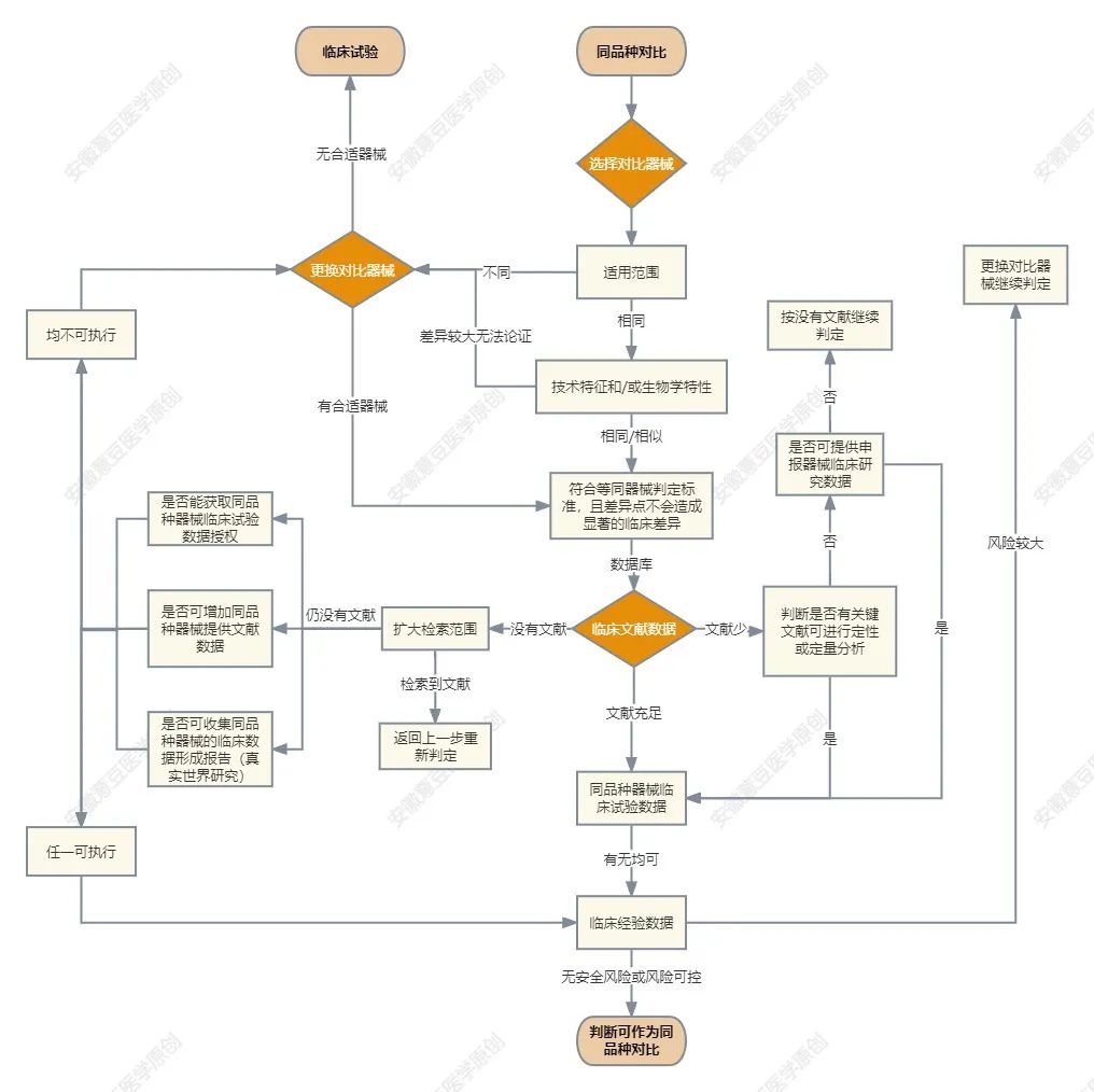 2. 申報產品是參照已上市產品設計開發,那優先采用參照器械作為同品種器械,后續步驟參照流程圖決策。這里建議申辦者在設計開發早期就做好這部分的調研工作,以確保后續注冊流程的順暢;